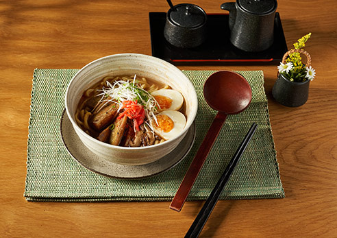 Sautéed eggplant and mushrooms served in a spicy miso ramen soup.