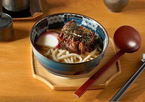 Thinly sliced sautéed teriyaki beef and onions served in a bowl of udon noodle soup.